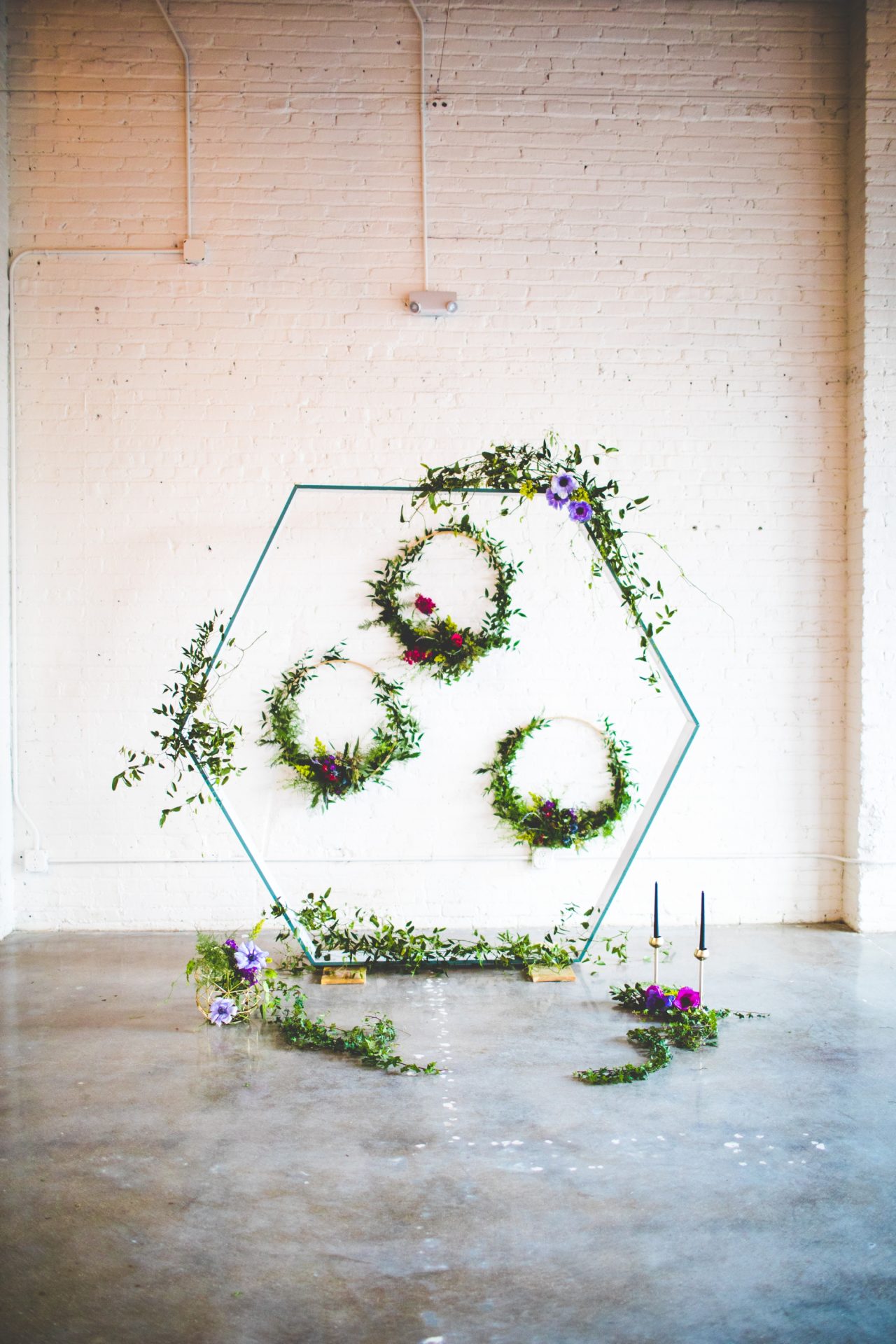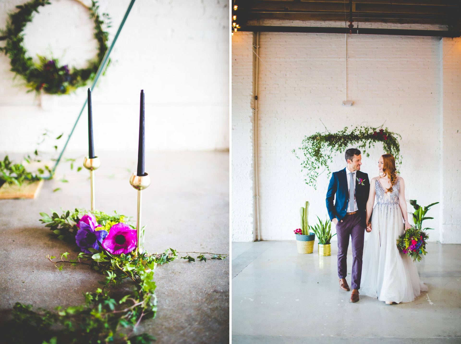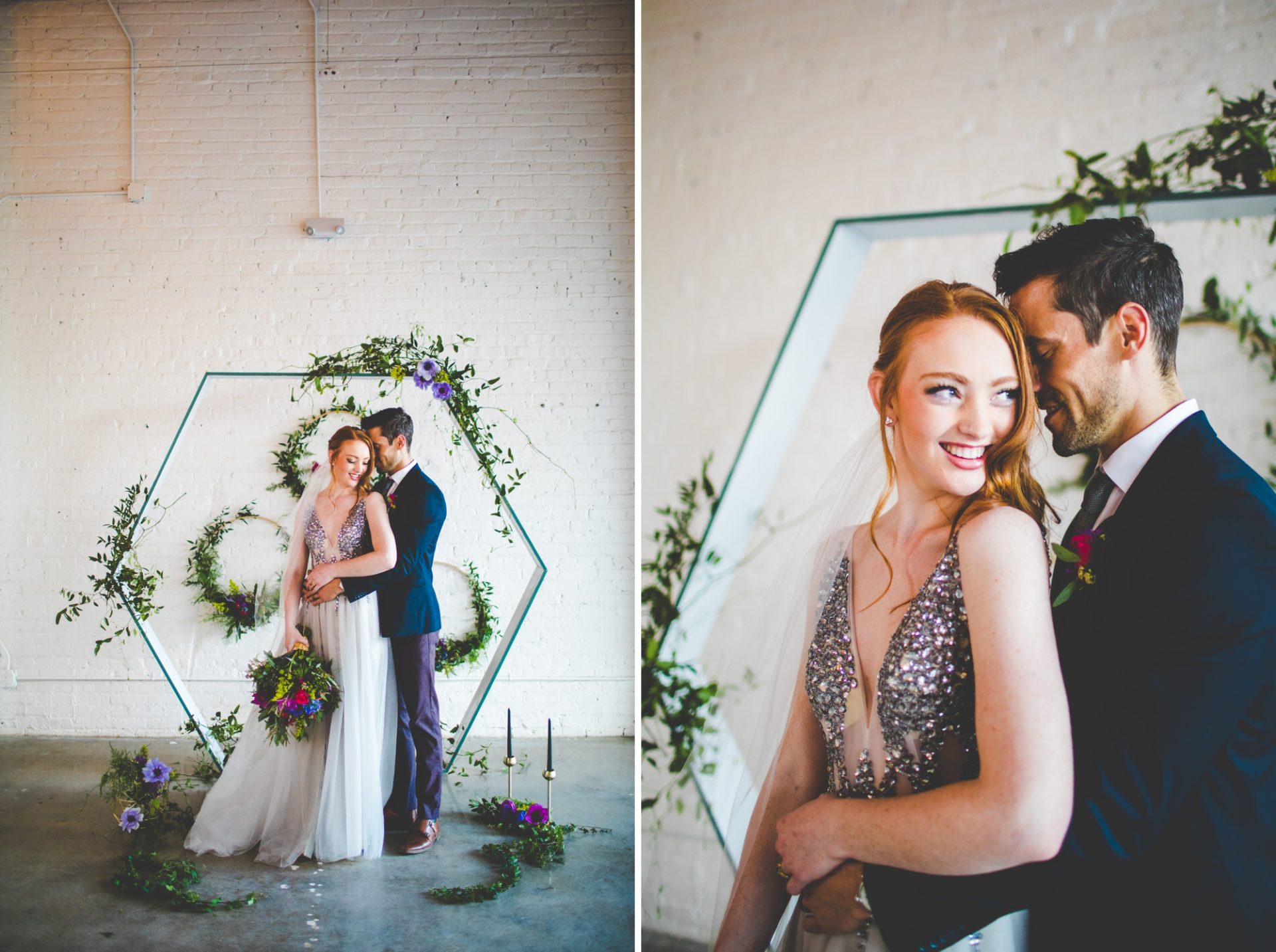 So many amazing people came together to make this shoot happen. Marzeyeh of Arrangements by Marzeyeh did all of the florals, Katie of Katie Keighin Photography made the hexagon backdrop, Abby of Shear Abby did hair and makeup, Cierra and Chandler (Henry still can’t get over that her first name is our last name – so cute!!) of NXT Model were our stunning brides, and Andrew moved a million things around to make this shoot happen. When I first planned the shoot, I wanted to do mountains but, the more we planned, the more I was into a really industrial setting and, when talking with Marzeyeh, came up with the idea of bringing the outdoors inside for this jewel-toned shoot. This was my first time planning such a large shoot in another state (but definitely not my last – stay tuned!) and I could not be happier with how it turned out. It was so incredible and everyone involved was seriously amazing and fun!!