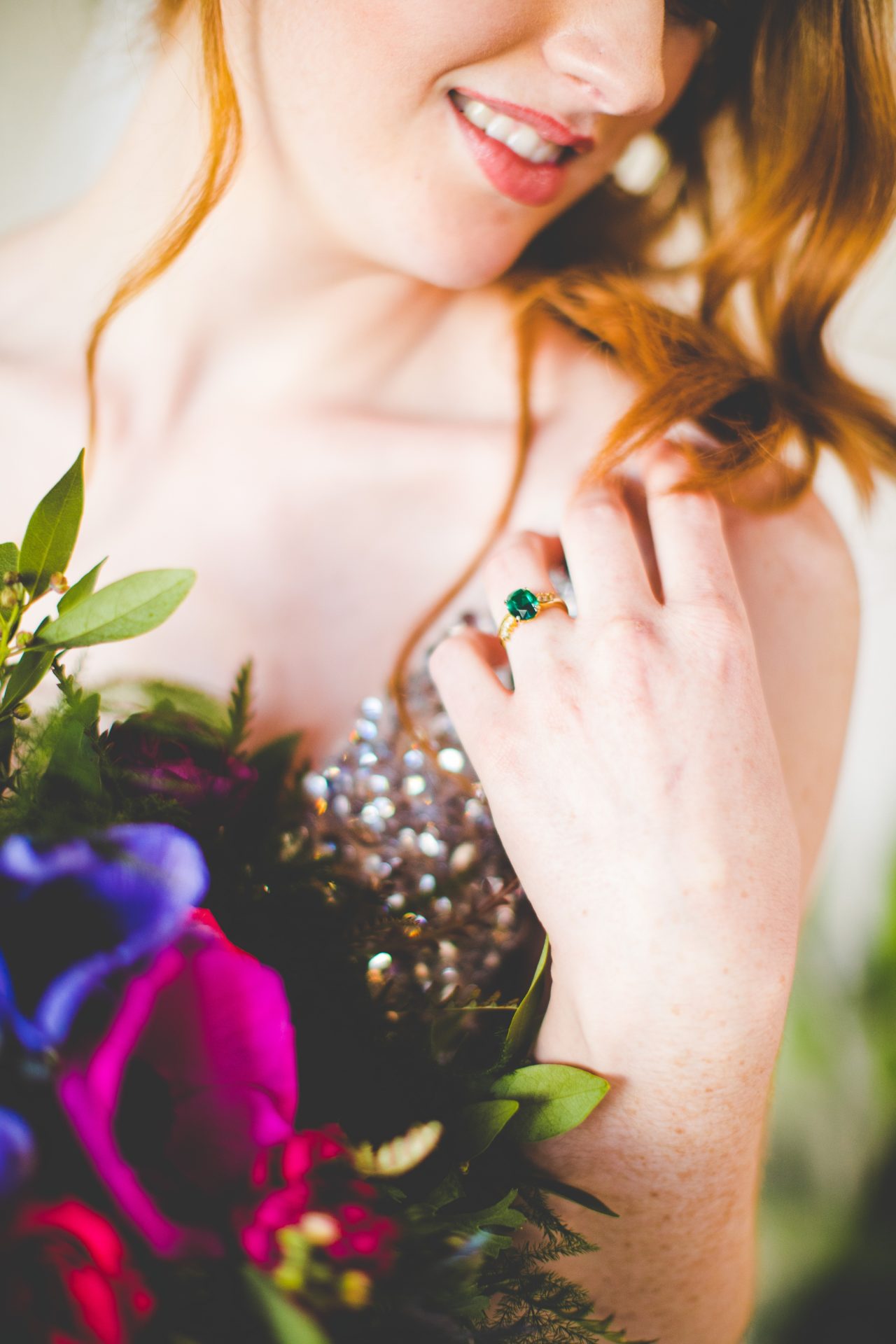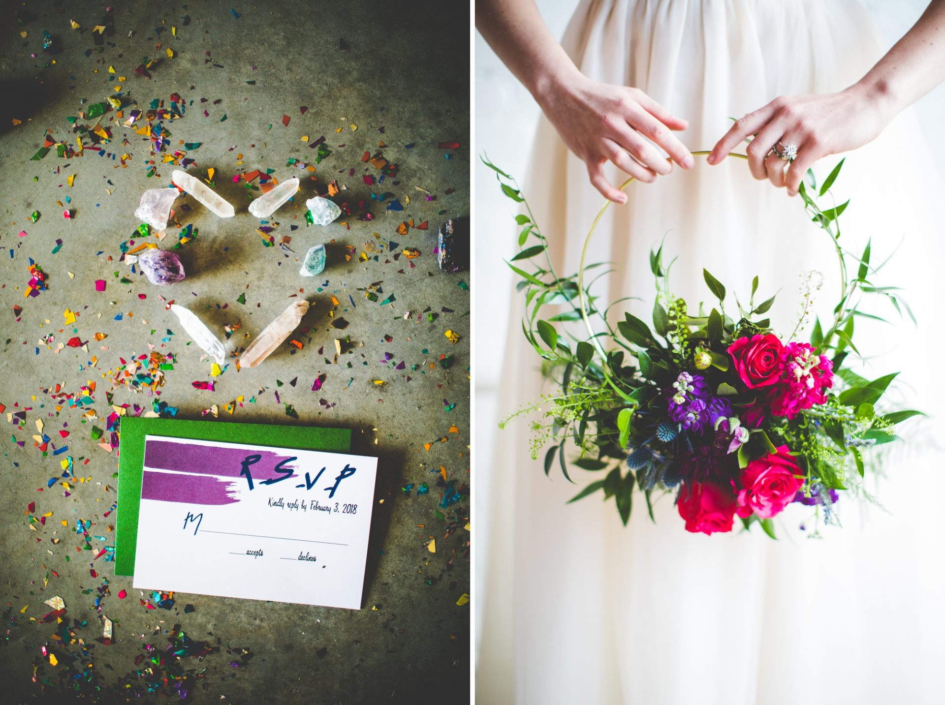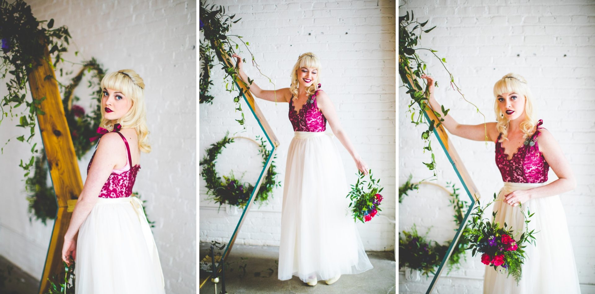 So many amazing people came together to make this shoot happen. Marzeyeh of Arrangements by Marzeyeh did all of the florals, Katie of Katie Keighin Photography made the hexagon backdrop, Abby of Shear Abby did hair and makeup, Cierra and Chandler (Henry still can’t get over that her first name is our last name – so cute!!) of NXT Model were our stunning brides, and Andrew moved a million things around to make this shoot happen. When I first planned the shoot, I wanted to do mountains but, the more we planned, the more I was into a really industrial setting and, when talking with Marzeyeh, came up with the idea of bringing the outdoors inside for this jewel-toned shoot. This was my first time planning such a large shoot in another state (but definitely not my last – stay tuned!) and I could not be happier with how it turned out. It was so incredible and everyone involved was seriously amazing and fun!!