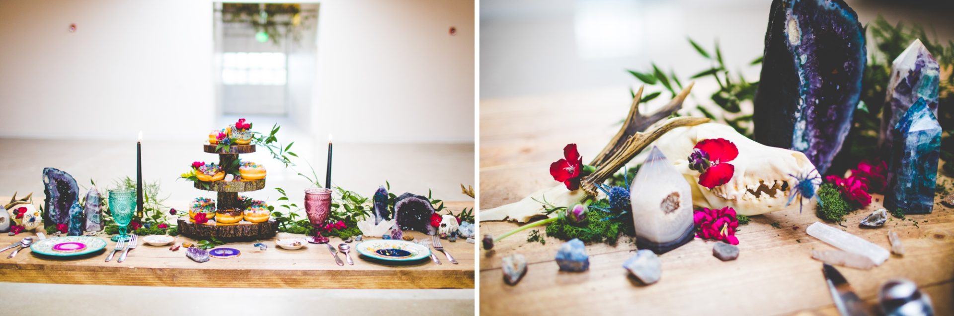 Bri grabbed these doughnuts for the shoot and then she and Shelby put rock candy and unicorn glitter on them (so freaking cute!!), Bri found the adorable place settings, snagged silverware from a restaurant next door, and brought this adorable doughnut tower used at her very own wedding, and Katie provided so many of these gorgeous rings, skulls, and gemstones. As for me? I brought black candles and rocks.