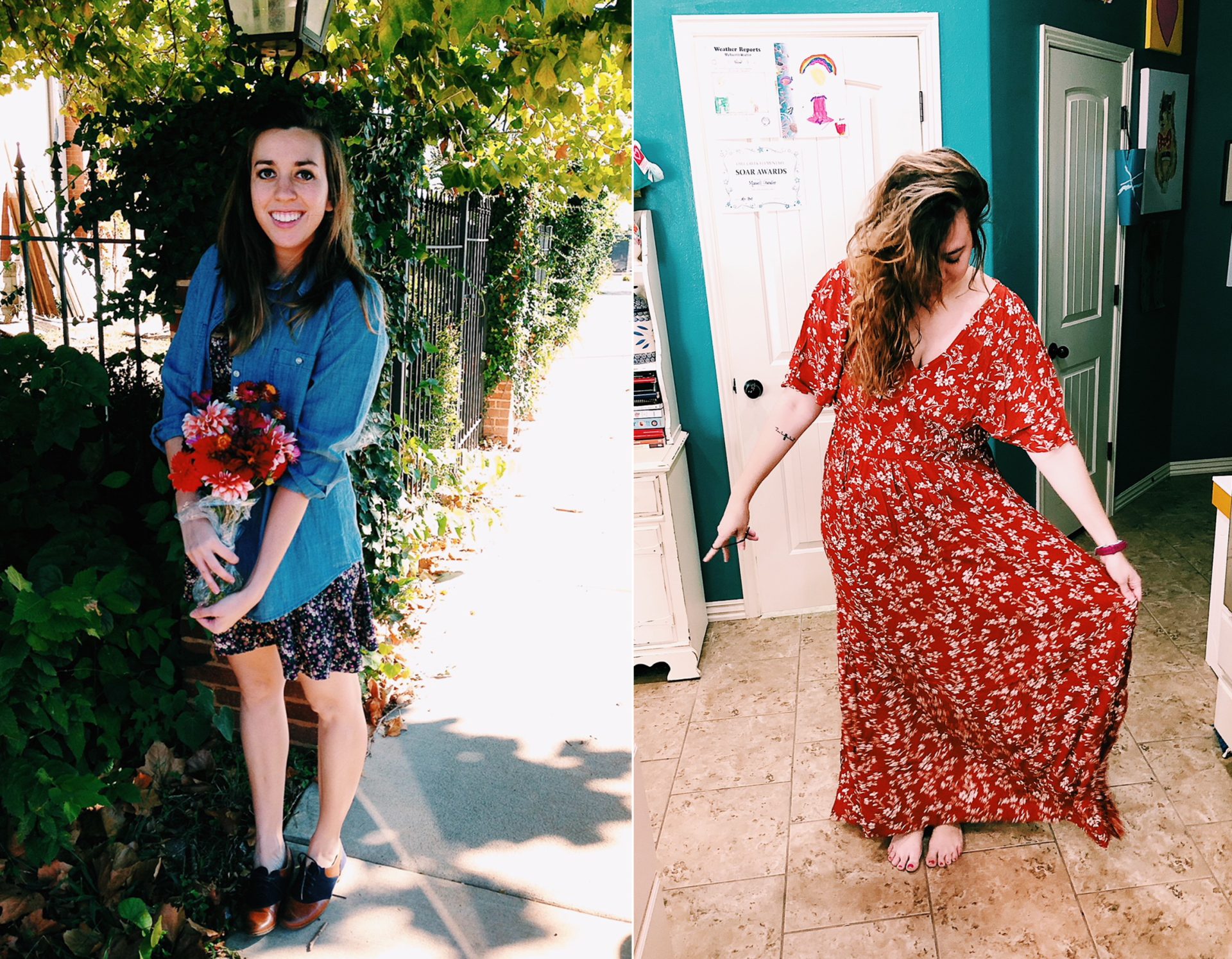 Third! I went full time in the fall of 2013 and the photo on the left was taken a few weeks after I made the jump. Andrew was in grad school, we had two kids under three and, the morning this photograph was taken, I had just booked my third wedding in five days and I was SO PUMPED! Four and a half years later, I still get so excited every single time I book a wedding – it’s one of my favorite feelings! – and I still wear flowers, like, every day. The photo to the right was taken a few weeks ago while I was in the middle of a multi-day editing spree (I hand edit everything, y’all! It can take me eight hours to edit a portrait session with fifty images!) and a new dress came in, I was obsessed with it, and wanted to share it with my bestie after gushing about it over, like, ten texts but also didn’t want to share my face because it was freaking puffy from not sleeping and staring at a computer screen for days on days. Hahaha.
