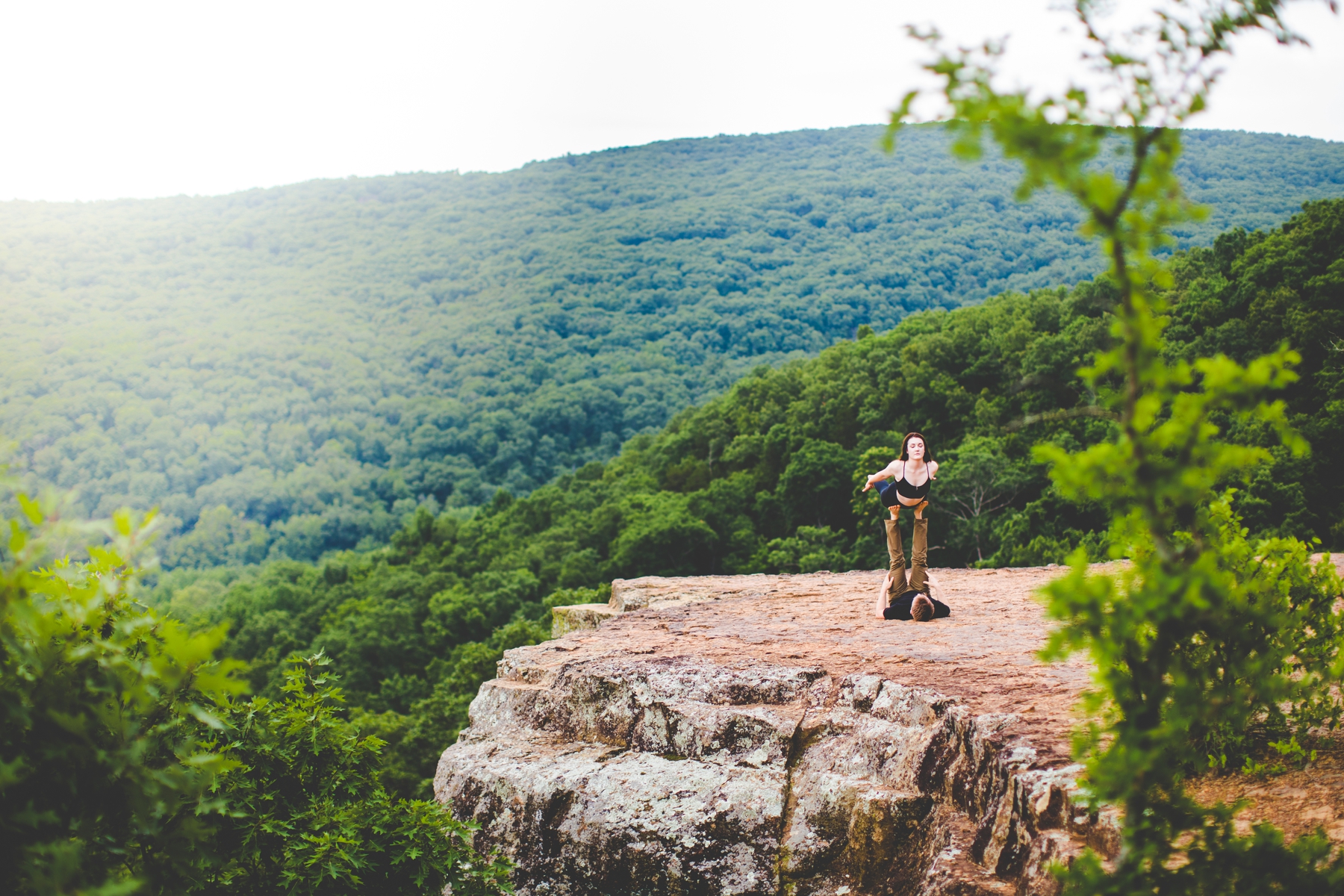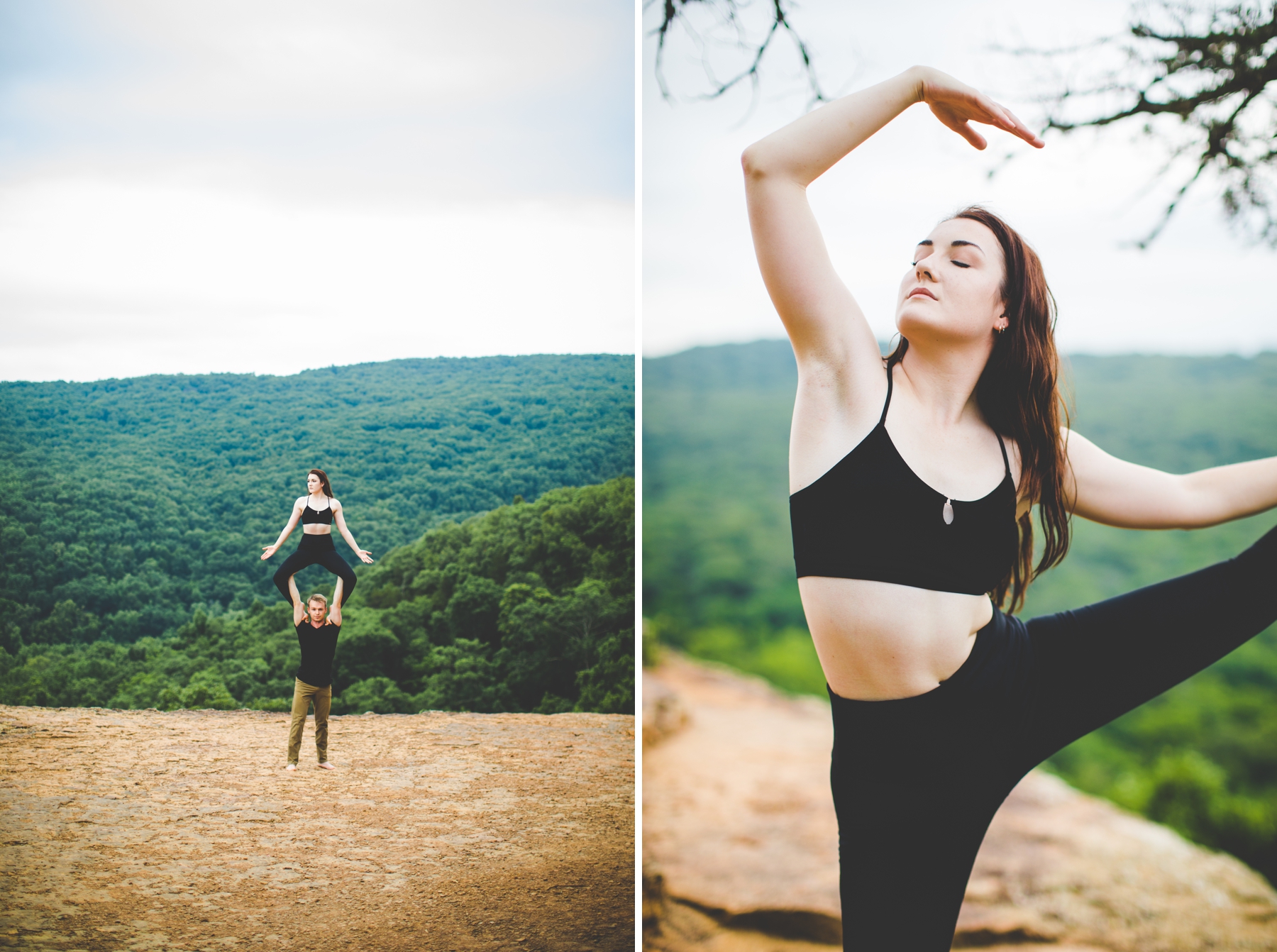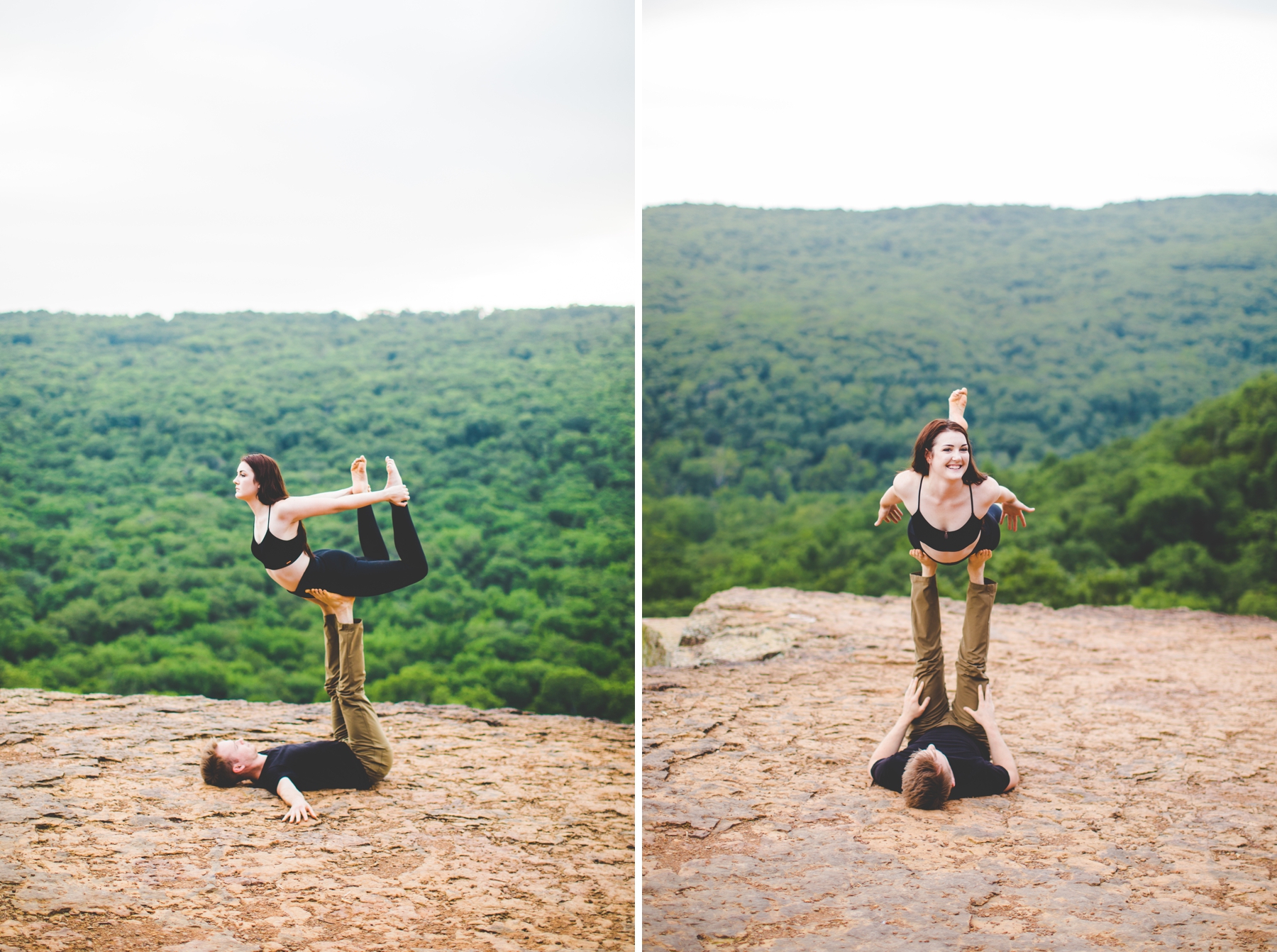 I’ve wanted to do a yoga shoot for ages and, last June, I was finally able to make it happen! I met Michaela and Johnny at Devil’s Den (my kids LOVE hiking here – if you’ve never been, you should start planning now!) , photographed them at Yellow Rock right after sunrise, and the whole shoot was beautiful! The green trees, the fog, and Michaela + Johnny’s crazy yoga skills made such a fun morning and I’m super excited to share these peaceful photographs with y’all! I love when I get to shoot sessions that are slightly out of my norm (weddings, engagements, editorials, families, seniors, etc.) and this one was so great!