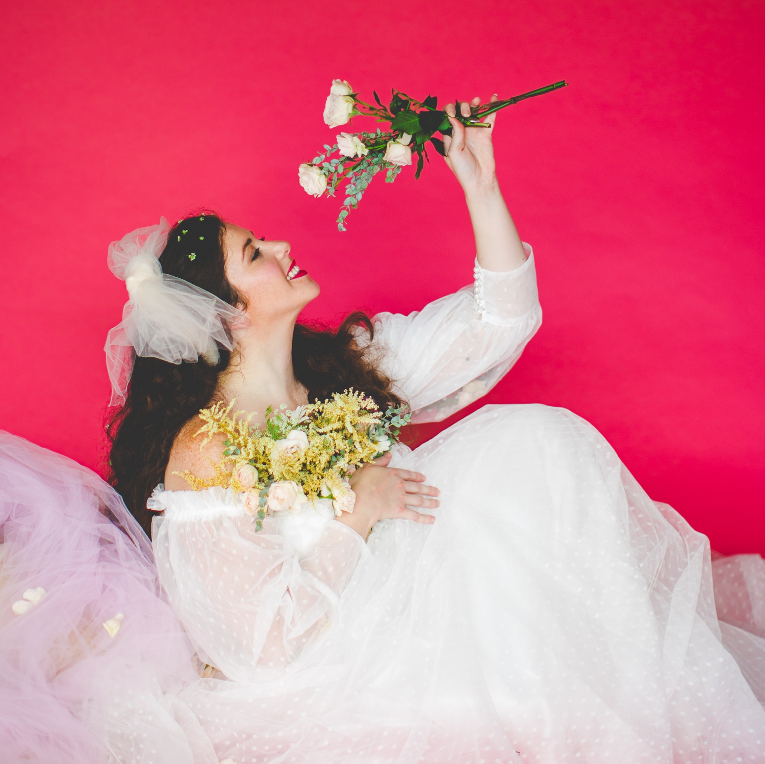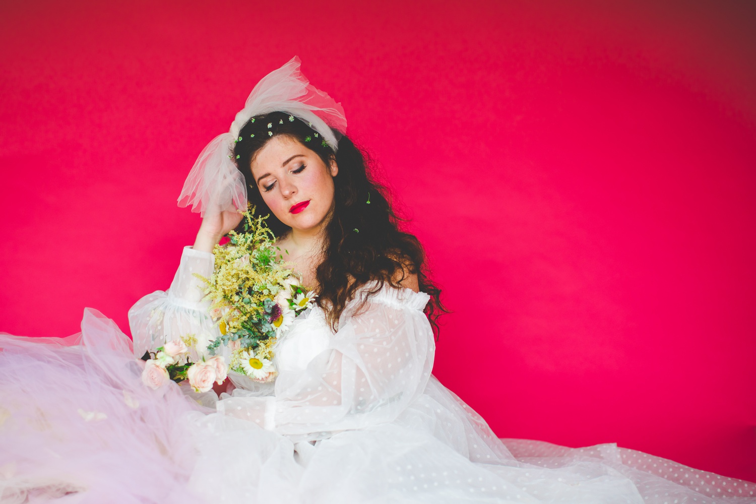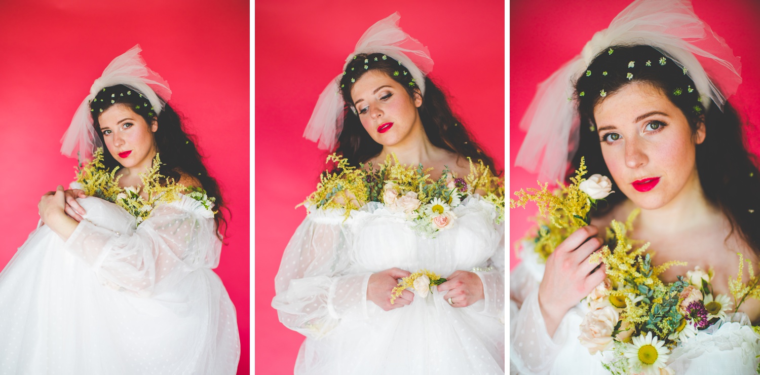 Case in point! This dress – Chloe! – came in one summer night and, because I was obsessed with it on arrival, I immediately texted my sister to come over first thing in the morning. The dress didn’t fit even a little right so we grabbed a bunch of flowers + pieces of tulle and spent our morning laughing in the garage as the summer sun got higher and hotter and our fake bridal session got more and more over the top.